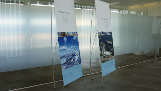 Striking floor or wall-hung display system. Simple frame made of glass bead blasted stainless steel. Two sizes. Easy to handle.