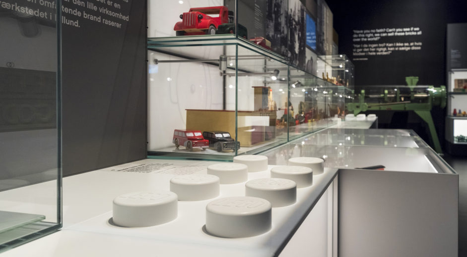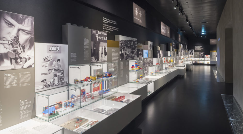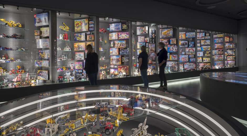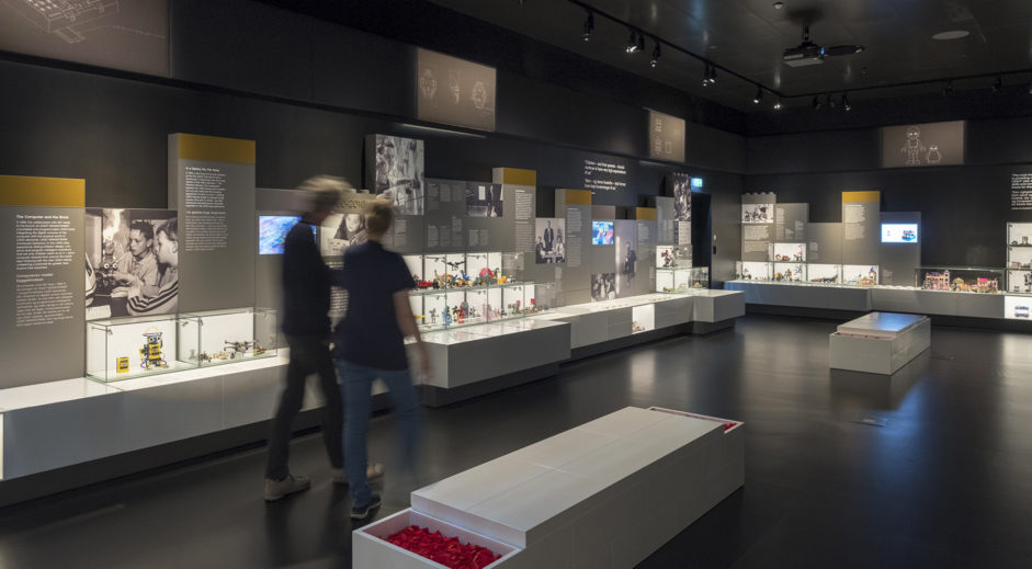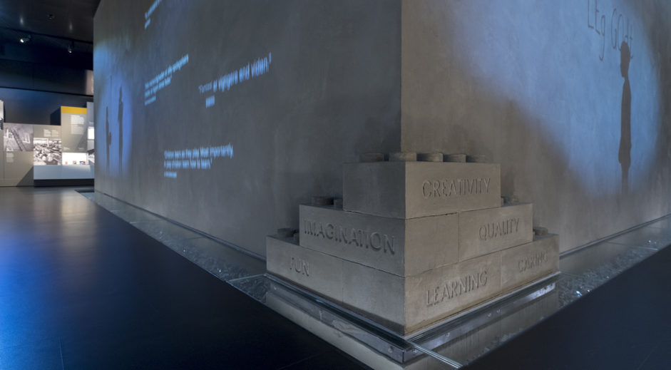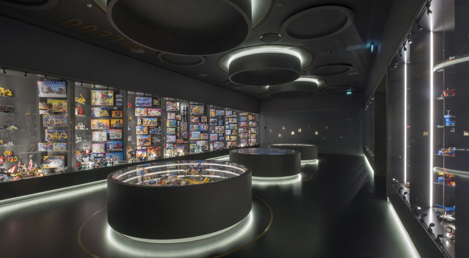 As grown-ups and kids head down the stairs, or descend by the elevator, into the basement and the History Collection, they are welcomed by a 2 x 2 metre logotype. Here they explore their own childhood through the gems of the exhibition: LEGO products conveying the company’s long history though significant milestones, drawings and models. Everything a true Lego fan could possibly imagine. Also animations of kids playing in classic scenarios.
