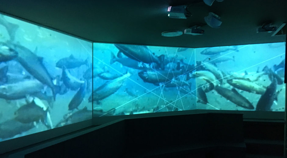 Kvorning and Vindfang’s concept conveys Norwegian fish-farming history from 1970 to the present day through three major narratives: The local history, with animation of Hitra and the area; the national history of the pioneers along the coast from Finnmark to Vestfold, and the history of the salmon and the industry as a reworked 360-degree show with moving pictures and natural sounds in Aegir’s Hall: the octagonal cinema. Silhouettes of the pioneers reflect the dynamics. Past and present.
