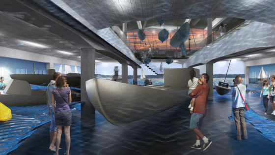 Semi-transparent waves make the ground floor come alive. Here one is out on the open sea surrounded by various kinds of boats. Atmosphere, facts and history in one go. Lights, sounds and live imagery support the expressive design. From the stairs leading up to the first floor, the visitors will see the vessels hanging in an atrium-like open space between the floors. This open space does not exist at the moment, but it is a strong feature, which we hope to add to the exhibition space.