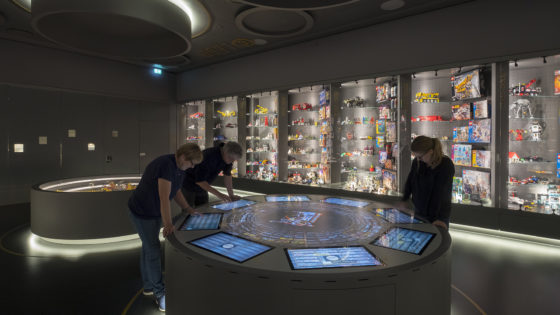 Halfway through the collection visitors will see a light which lures them into a room resembling the interior of a giant LEGO brick. An exhibition of original LEGO models and boxes through decades. Anyone can find a cherished LEGO box, either as a physical model or on the interactive table displaying more than 5,000 LEGO boxes. In big round showcases and along the walls are hundreds of original models and boxes on display to stir dear memories.